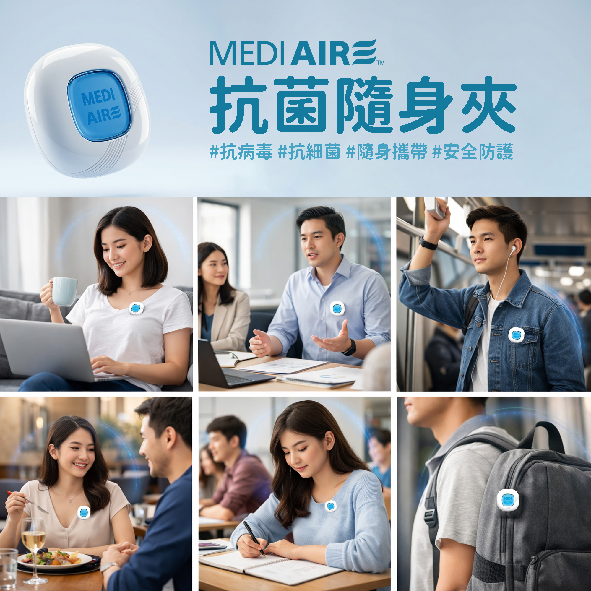 A4:建議夾在胸前衣領、識別證、或是隨身包包的背帶上,讓防護網能完整覆蓋您的口鼻周圍(約半徑 30 公分內)。無論是搭乘捷運高鐵、進出醫院診所、或是連假出遊人擠人,都能隨時為您淨化周遭空氣。